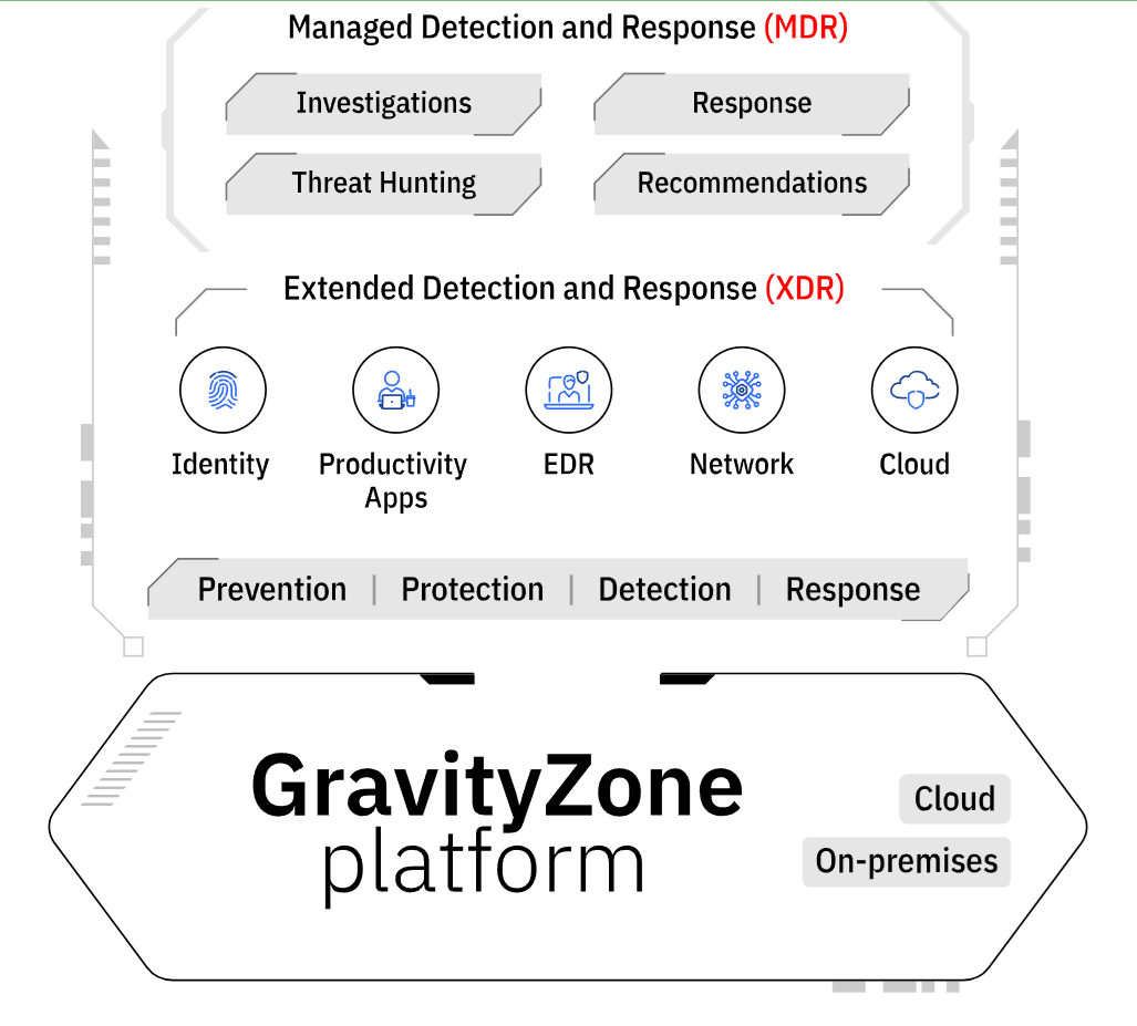 - Recomendado para MSP que deseen una protección integral contra las amenazas con monitorización disponible todos los días y a todas horas, así como prevención, detección y reparación avanzadas con la tecnología de GravityZone XDR.